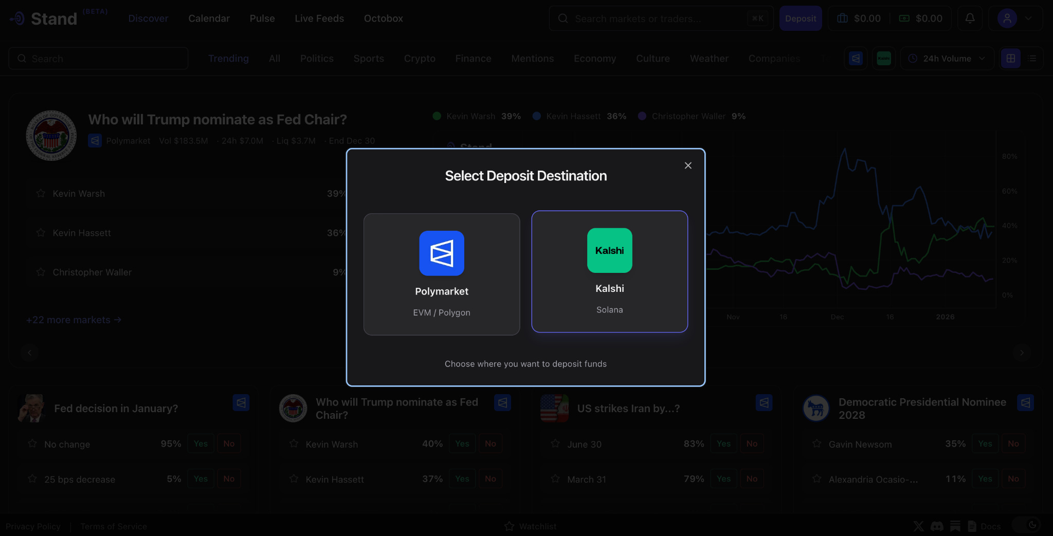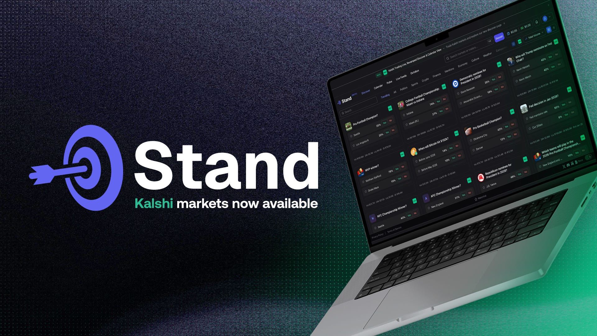 Kalshi and Polymarket are just the beginning. We are already working with other prediction markets to integrate them into Stand. If you’re a prediction market and want to be integrated in Stand, reach out in our Discord.