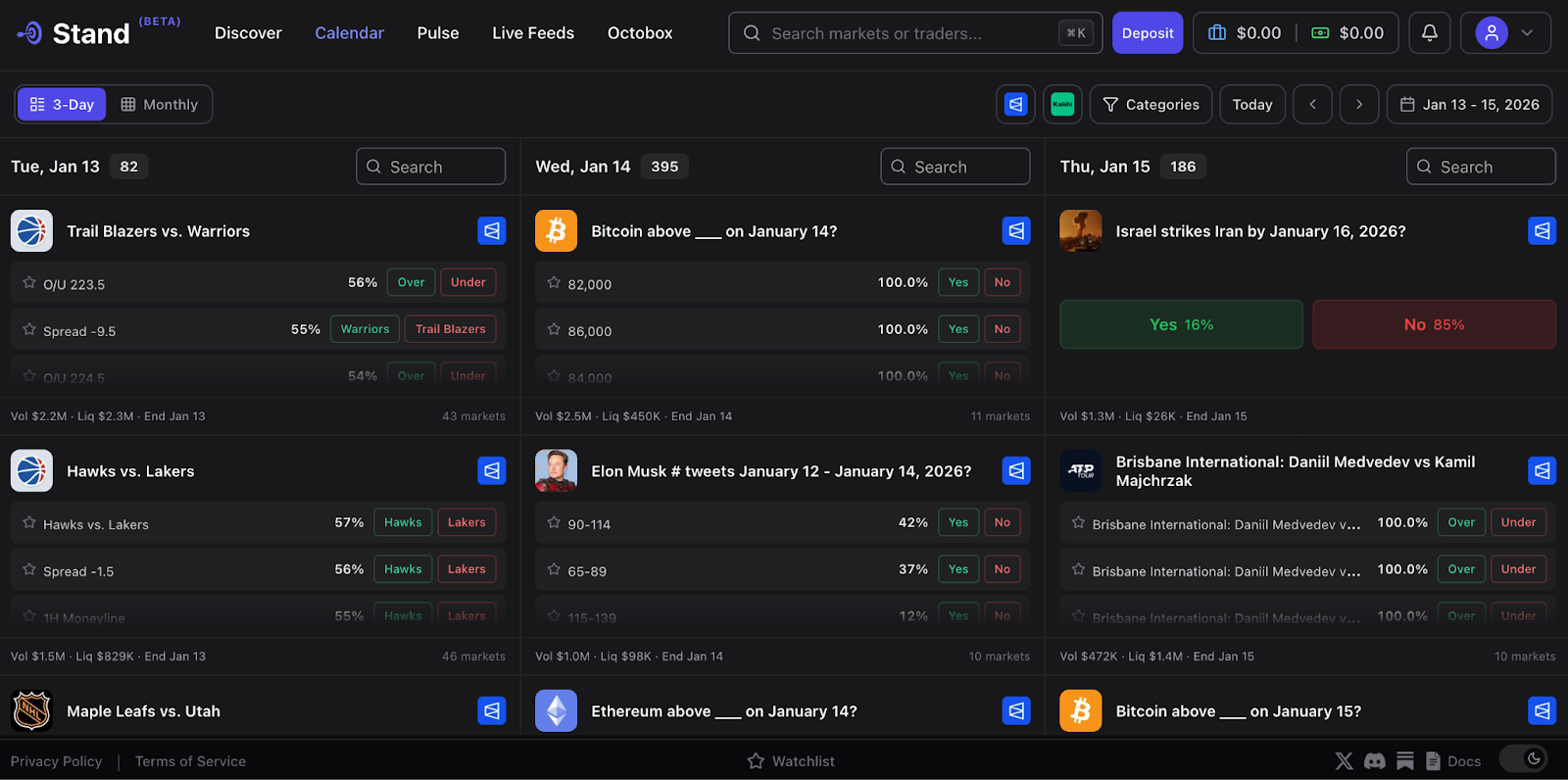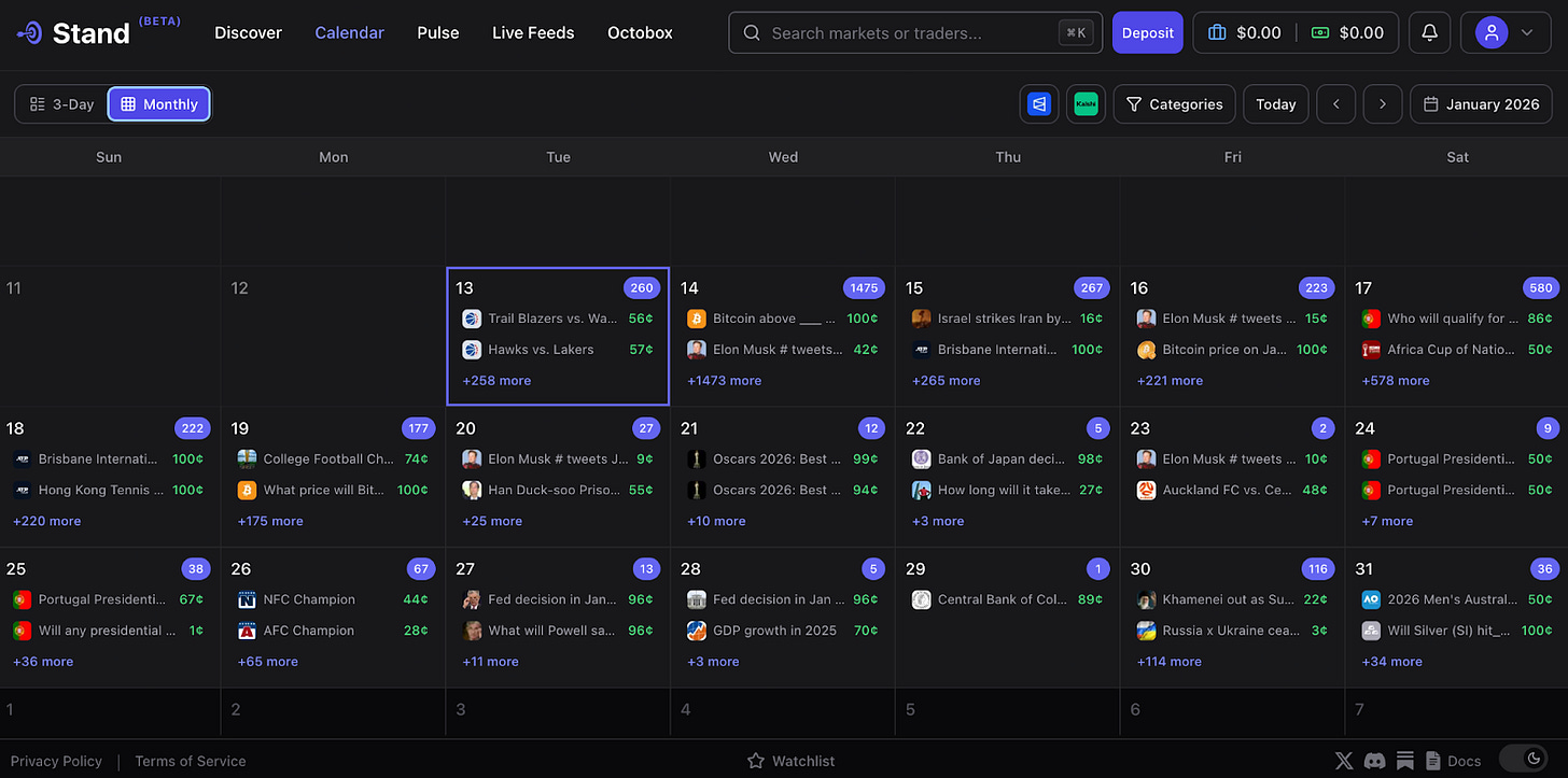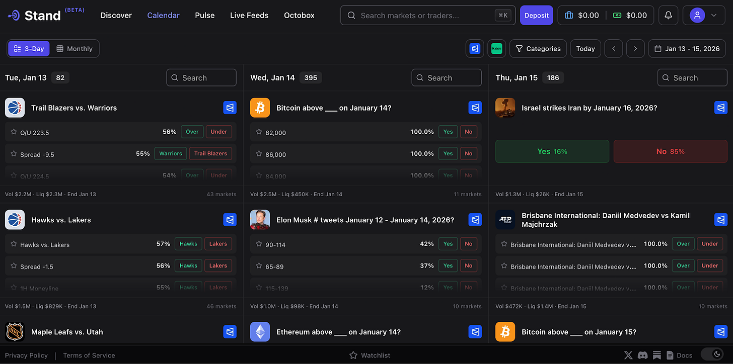 To celebrate the occasion, we used the Kalshi integration to revamp Discover too. Finding the right markets is painstakingly difficult for prediction markets on one platform, let alone across several. Traders need to know what’s available to trade and when it’s available to trade. Stand now pulls all the events and markets across Polymarket and Kalshi to make it even easier for pro traders to find.