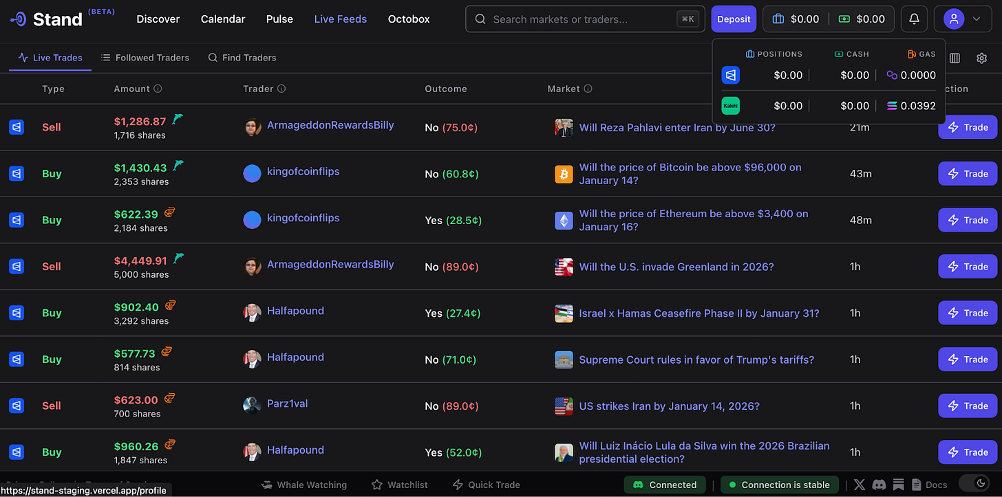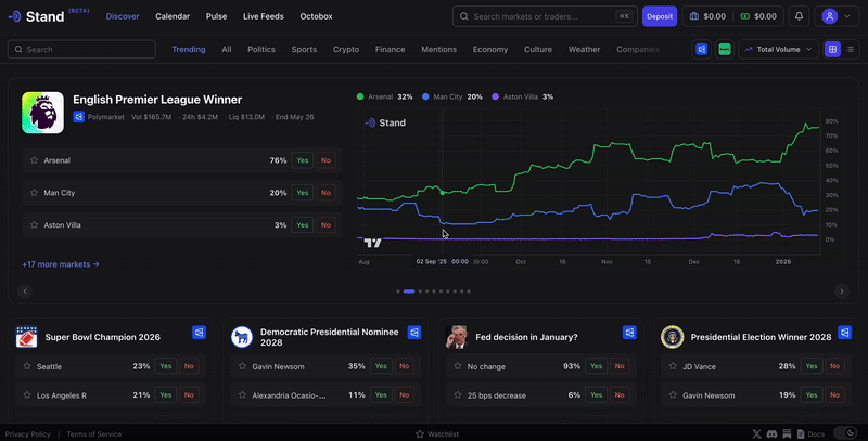 Stand already brings powerful tools to professional traders like automated trades, real-time trade feeds, and wallet tracking all in one place. As of today, Stand is no longer a simple trading terminal, Stand is now a prediction market aggregator.