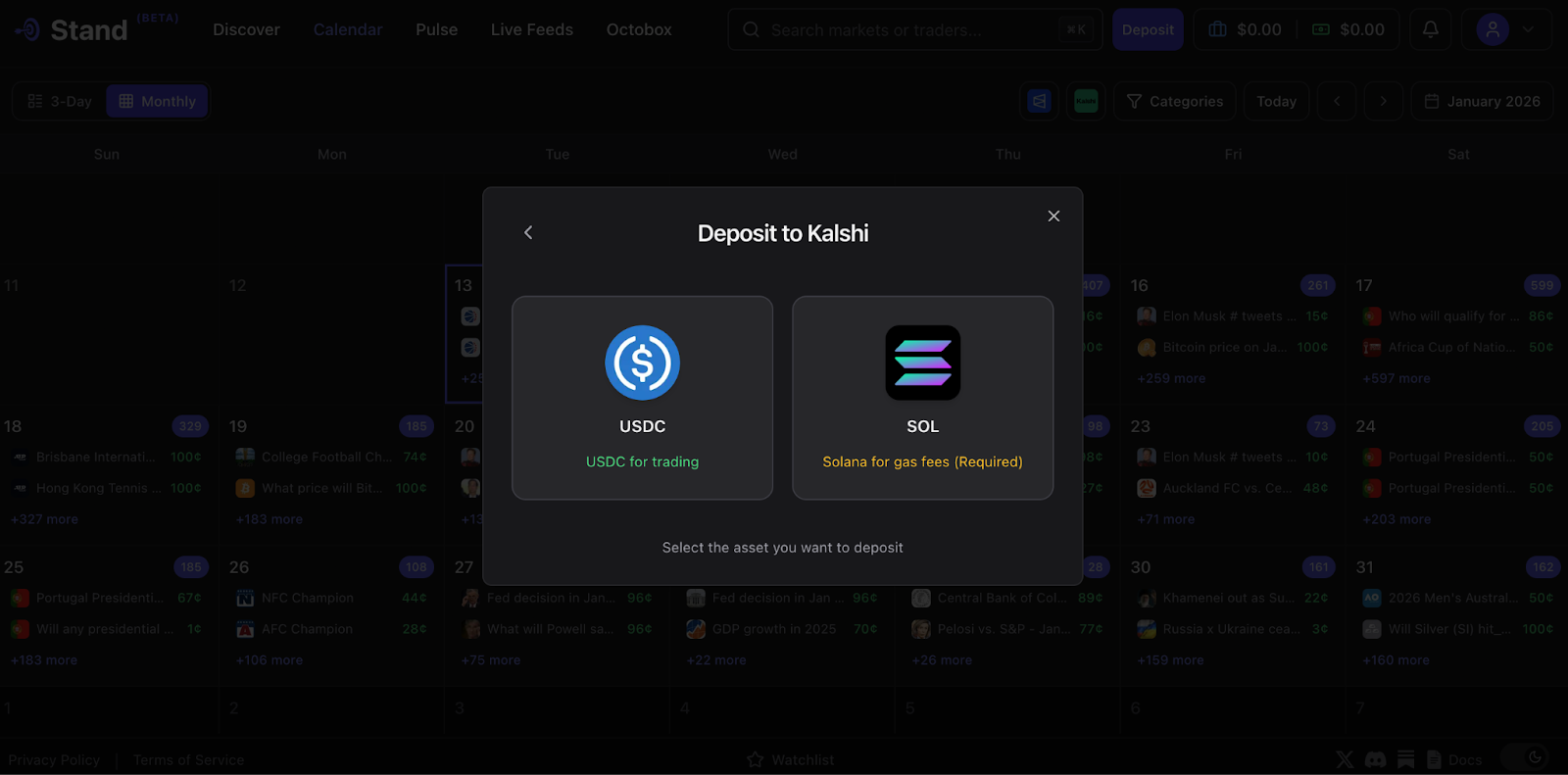 The entire experience is on-chain on Solana thanks to our partners over at DFlow. When you click Kalshi on Stand, a Solana wallet will automatically be created for you. You can read more about it in our documentation.